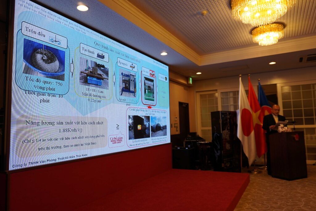 2025年10月21日にベトナム農業環境省、農林水産省、ベトナム大使館主催の在日ベトナム大使館で開催された「ベトナムのメコンデルタ地域におけるグリーン成長に資する高品質・ 低炭素米生産の投資促進会議」にて「もみ殻(燻炭)とCNFによる断熱材」の発表をしました。