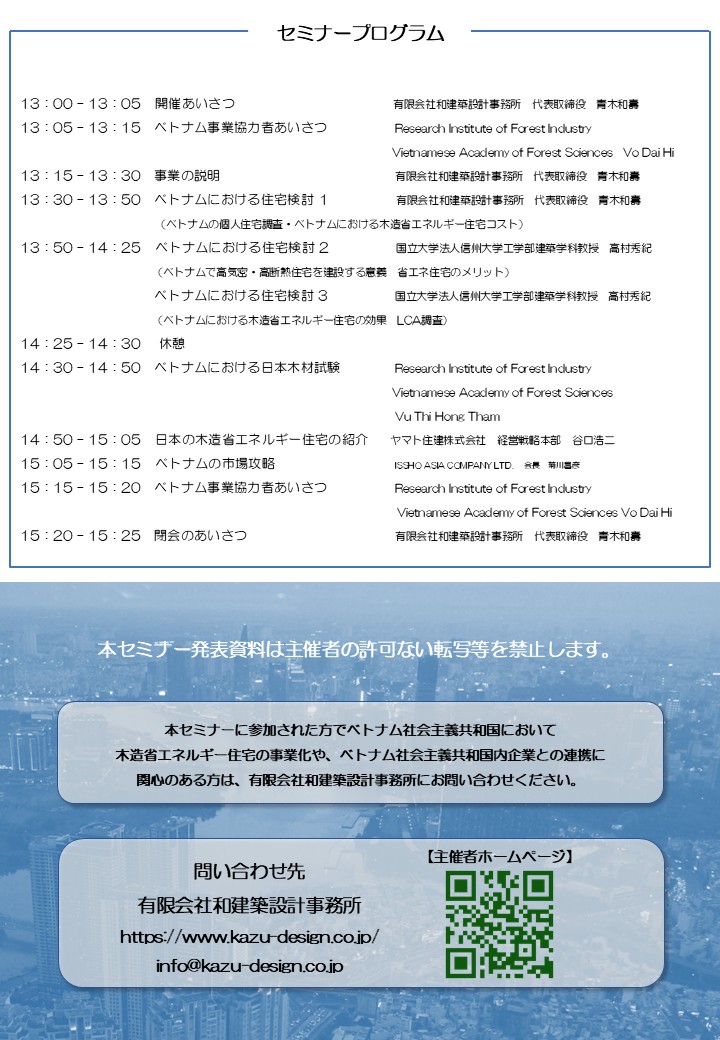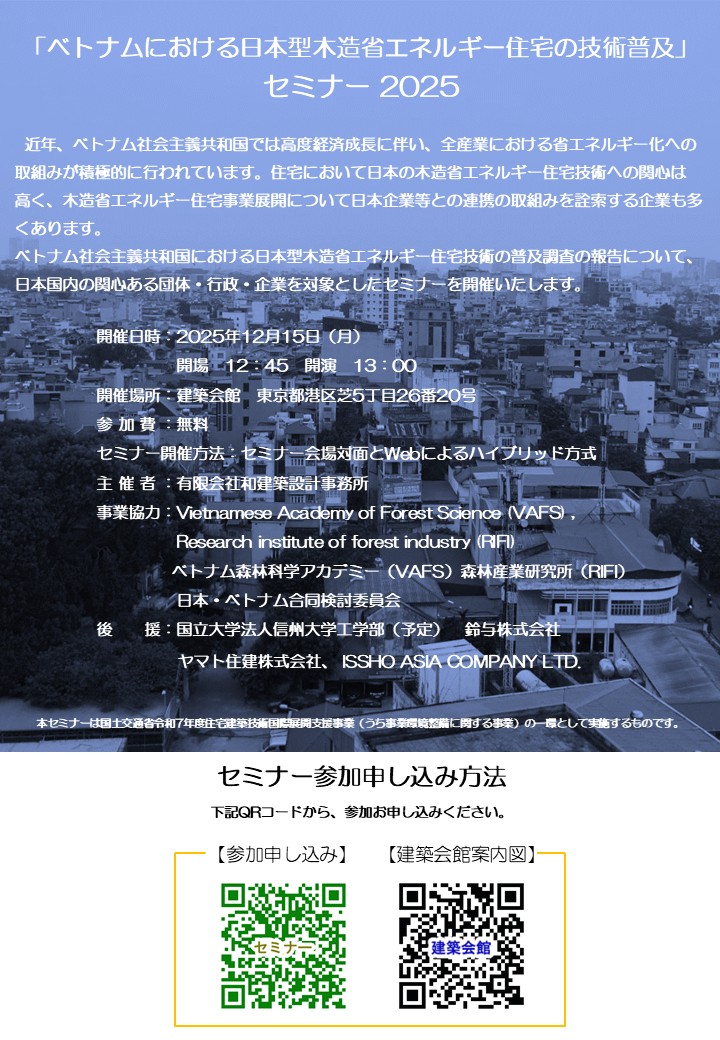 2025年12月15日に建築会館にて、「ベトナムにおける日本型木造省エネルギー住宅の普及」セミナー2025を開催します。