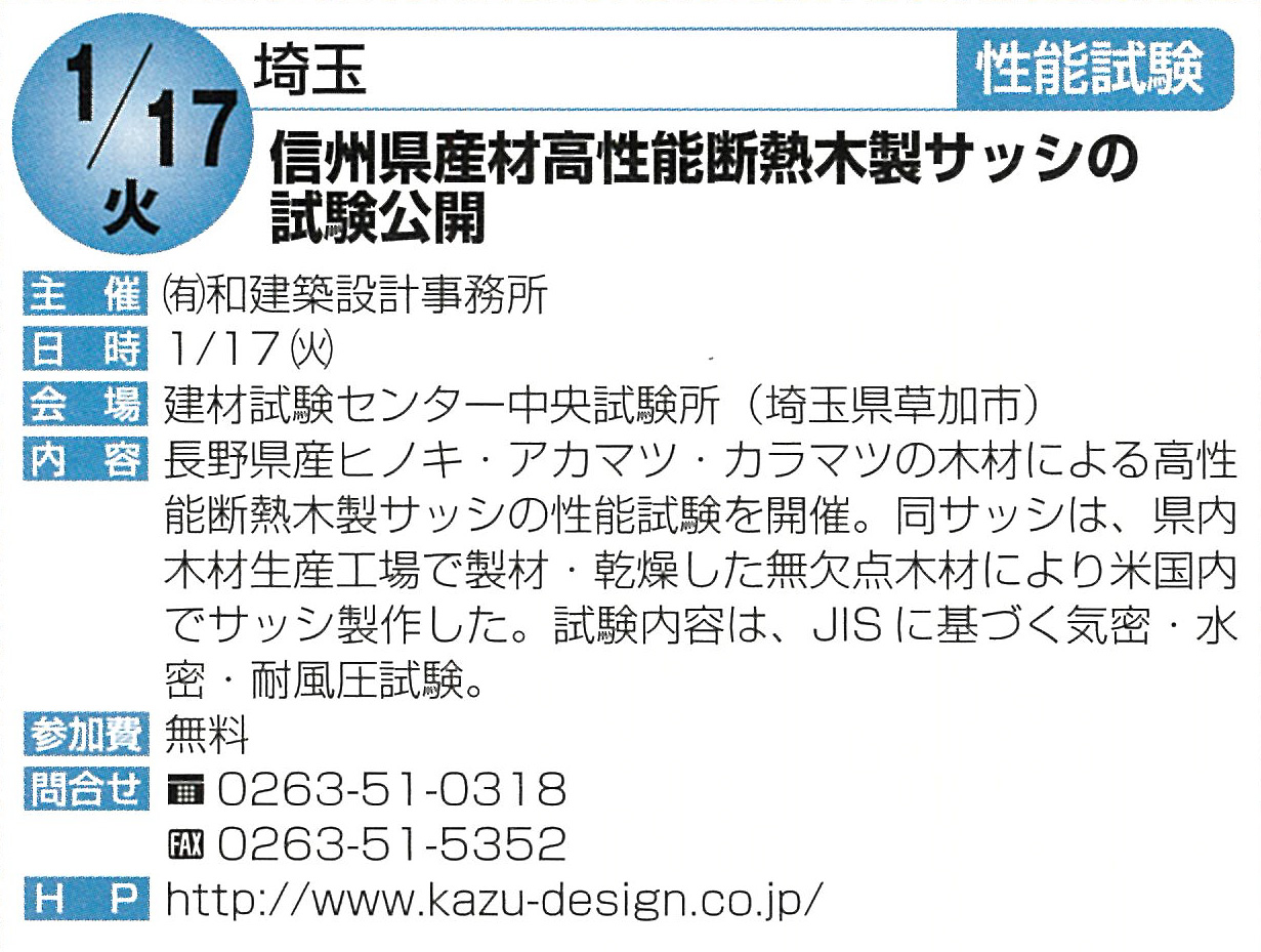 掲載記事 ○新建ハウジング 2011年 11月20日 イベントガイド 信州県産材高性能断熱サッシの試験公開